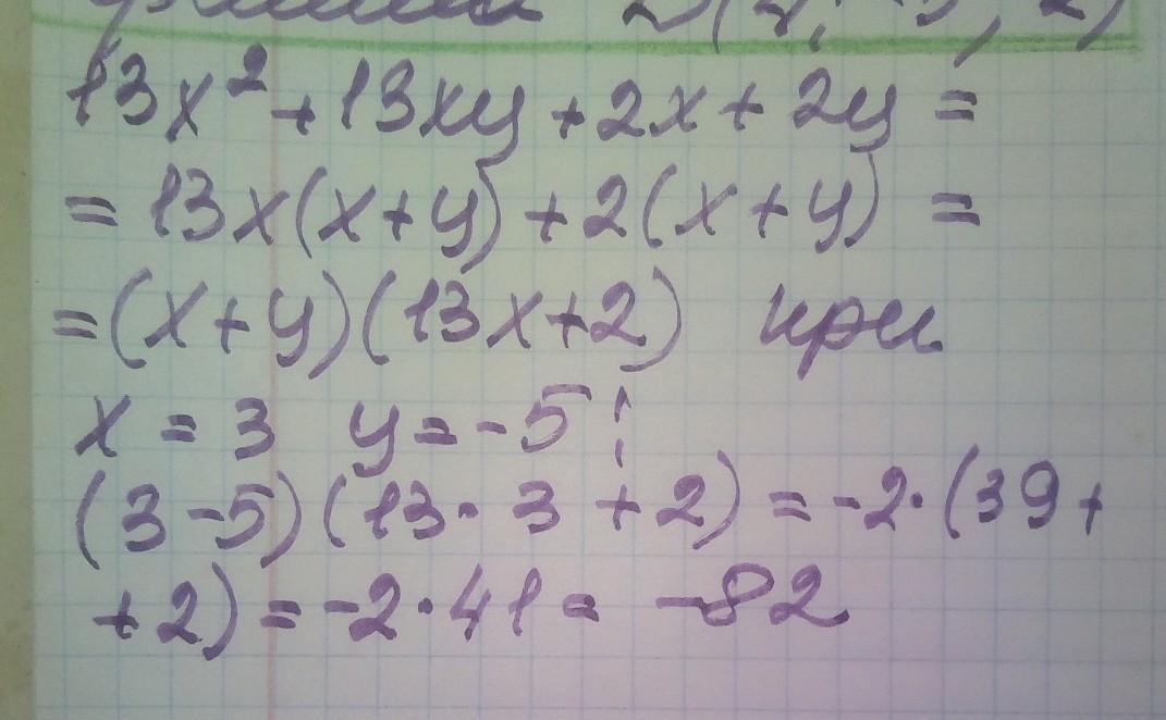 13х2 + 13ху + 2х + 2у если х = 3, у = – 5