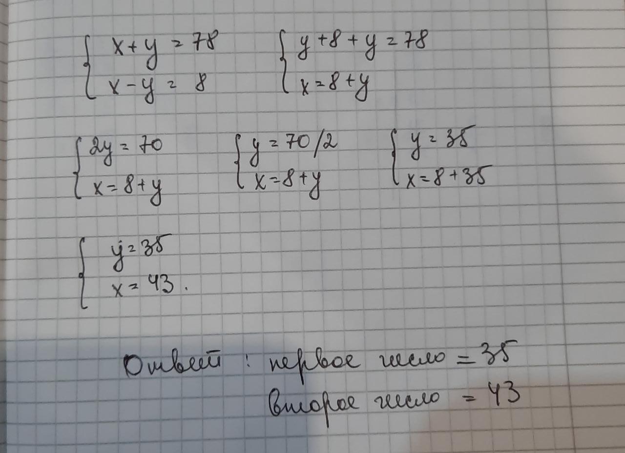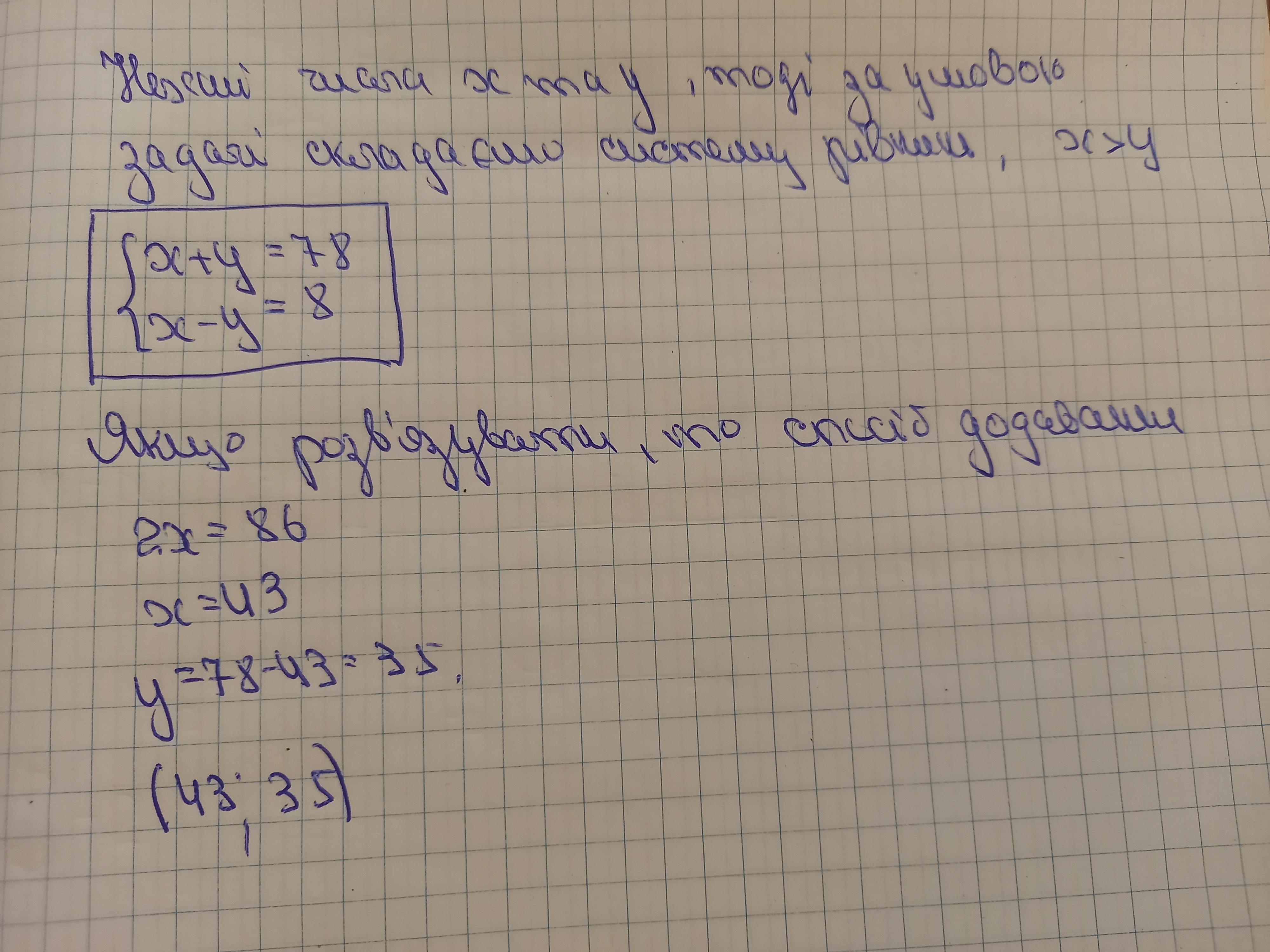 Сума двох чисел 78, а різниця дорівнює 8. Знайти ці числа. Яка із систем відпо-відає умові задачі, якщо більше число позначено через х, а менше через у?