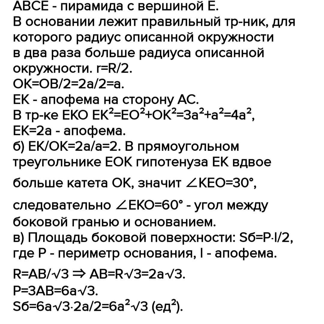 высота правильной треугольной пирамиды равна а√3, радиус окружности, описанной около её основания, равен 2а. Найдите: