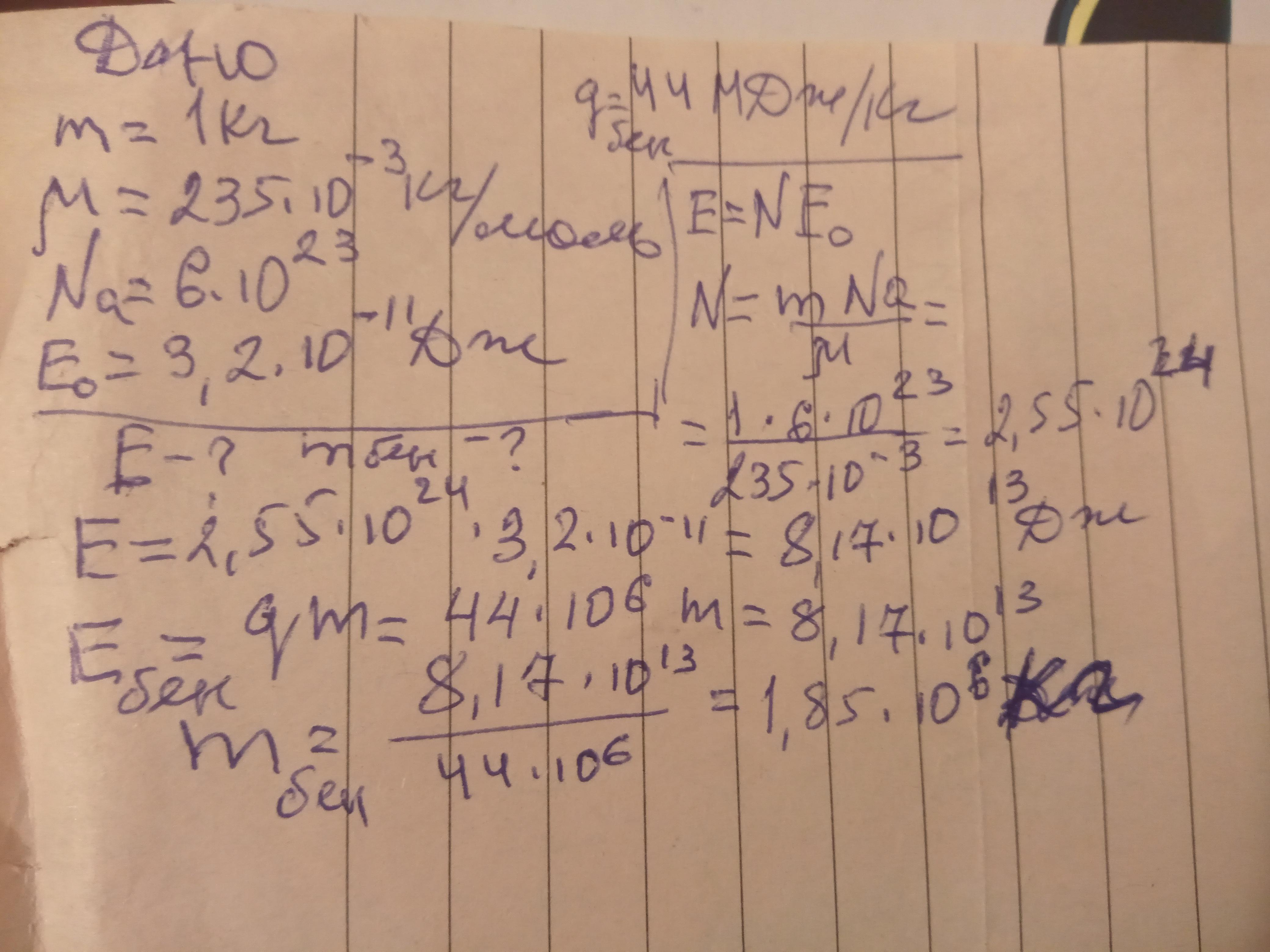 Вслідок поділу одного ядра Урану-235 виділяється 3.2*10^-11 дж енергії. Яка кількість енергії вивільняється внаслідок повного поділу 1кг цього ізотопу. Яку кількість бензину треба спалити, щоб отримати таку кількість енергії?Питома теплота згоряння бензину становить 44 МДж/кг.