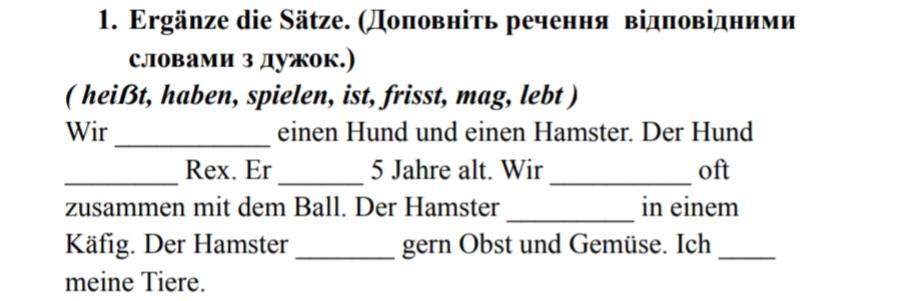 Wir haben einen Hund und einen Hamster. Der Hund heißt Rex. Er ist 5 Jahre alt. Wir spielen oft zusammen mit dem Ball. Der Hamster lebt in einem Käfig. Der Hamster frisst gern Obst und Gemüse. Ich mag meine Tiere