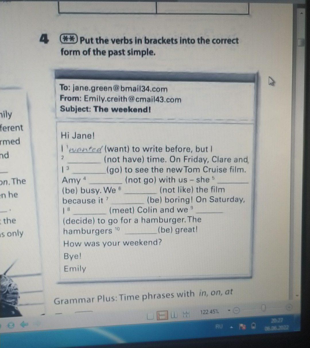 2. ...but I didn't have time.3. ...went to see ... 4. Amy didn't go with us- she was busy. 6. We didn't like the film because it was boring. 8. On Saturday we met Colin and we decided to go for a hamburger. The hamburgers were great ...