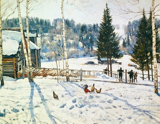 Худоожник К. Ф. Юон очень любил природу , и поэтому она на его картинах яркая, радостная. С юольшим мастерством в картине "Конец зимы. Полдень" . На полотне изображена деревенская окраина, покрытая снегом.