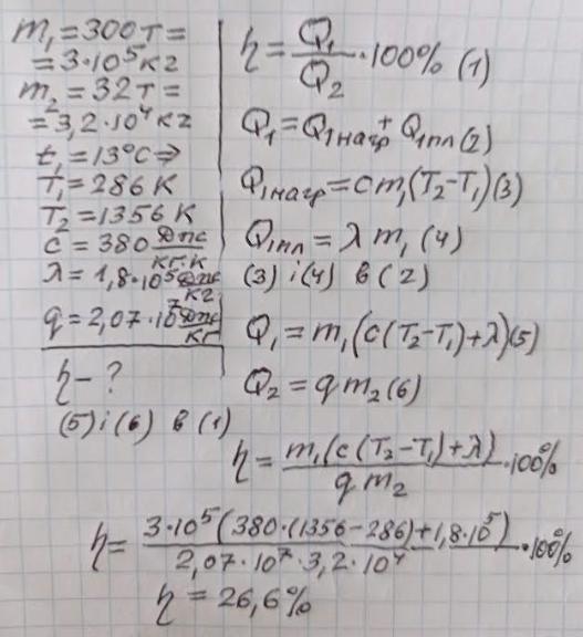 Чому дорiвниое КKД плавильноÏ печi , якщо в неï потрiбно pозлавити 300 T Miдi , сплавивши 32 т кам'яного вугiлля марки А - 1 . Початкова темпеpатуpа Міді 13 С , температура плавлення 1356 к , питома теплота згоряння вугiлля 2,05 * 10⁷ Дж / кг , питома теплоємнiсть мiлi 380 Дж / Kг K , питома теплота плавлення 1,8 * 10⁵ Дж / Kг .