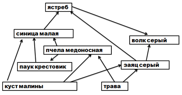 Составьте схему сети, в которую входят организмы: трава, заяц серый, волк серый,кусты малины лесной, паук - крестовик, пчела медоносная, синица мала, ястреб мал.