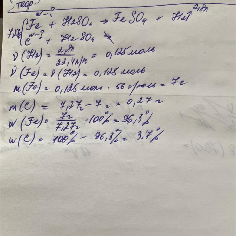 Зразок сплаву заліза з вуглецем масою 7,27 г розчинили в розведеній сульфатній кислоті. Об'єм водню, що утворився склав 2,8 л (н.у.). Визначте склад сплаву у %.