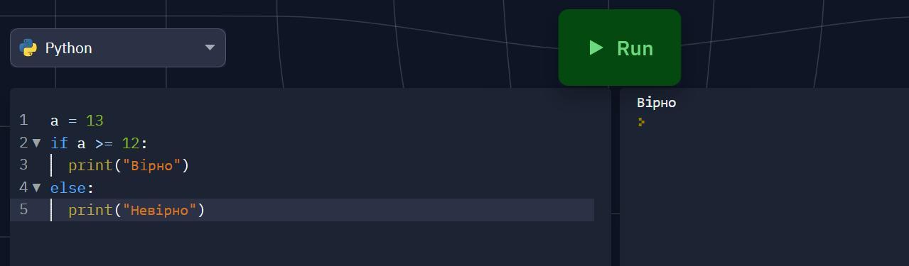 2) Теперь используем конструкцию if (если): если а больше или равно 12, то выводим "Вiрно". А иначе (else), т.е. если значение а меньше 12, - выводим "Невiрно".