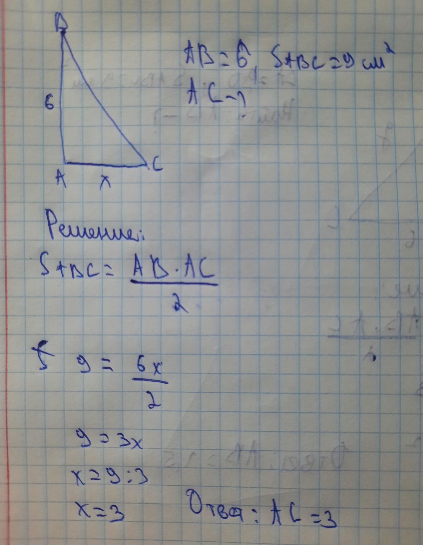 Найди длину второго катета прямоугольного треугольника если первый катет равен 6см и площадь треугольника 9см в квадрате