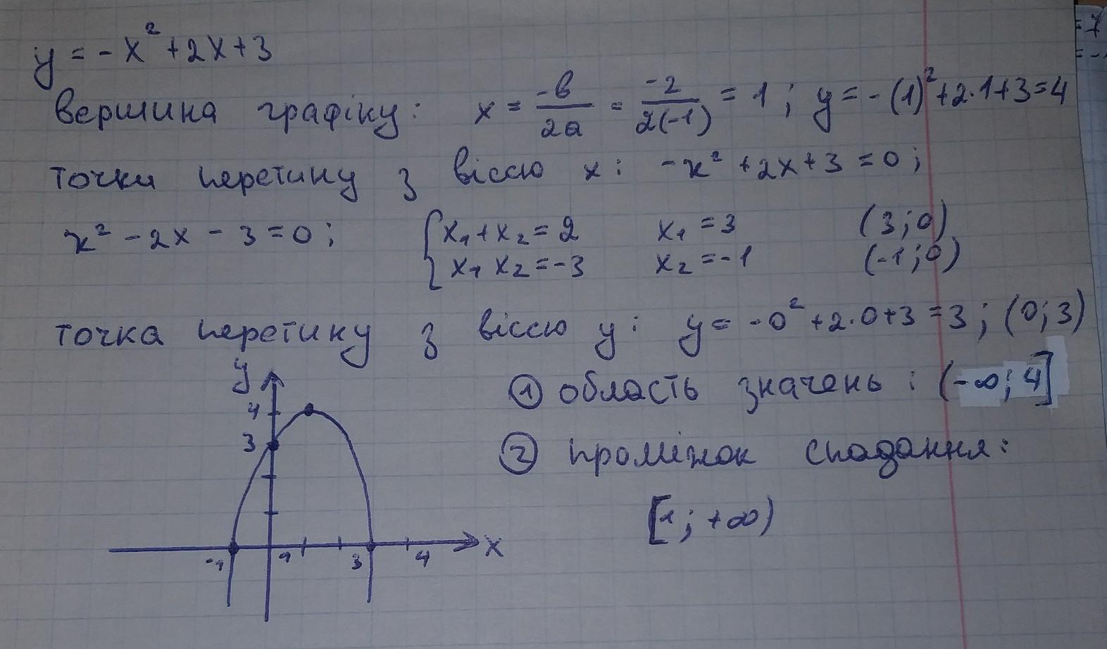 Побудуйте графік функції y=-x^2+2x+3. За графіком графіком, знайдіть: 1) область значень функції. 2) проміжок спадання функції.