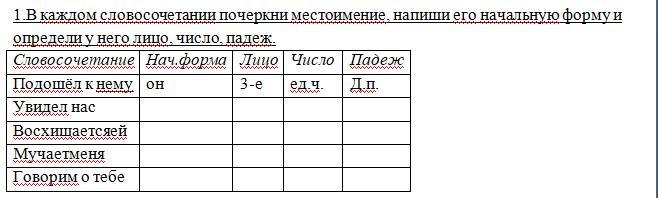 1.В каждом словосочетании подчеркни местоимение, напиши его начальную форму и определи у него лицо, число, падеж.