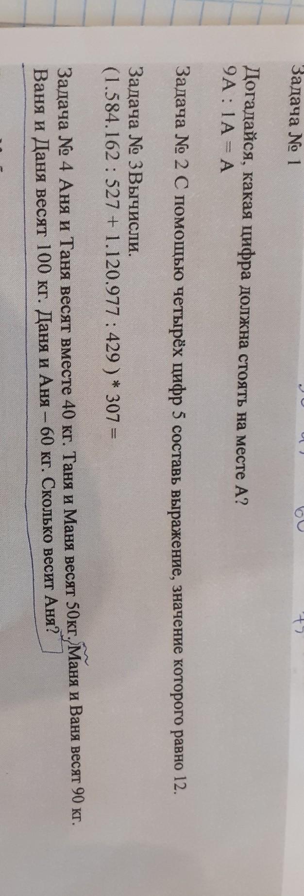 Таня и Аня весят 40 кг. Предположим что они обе весят 20 кг. Таня и Маня(50 кг), Маня 30 кг. Маня и Ваня(90 кг), Ваня 60 кг. Ваня и Даня (100 кг), Даня и Аня(60кг). 60-40=20.