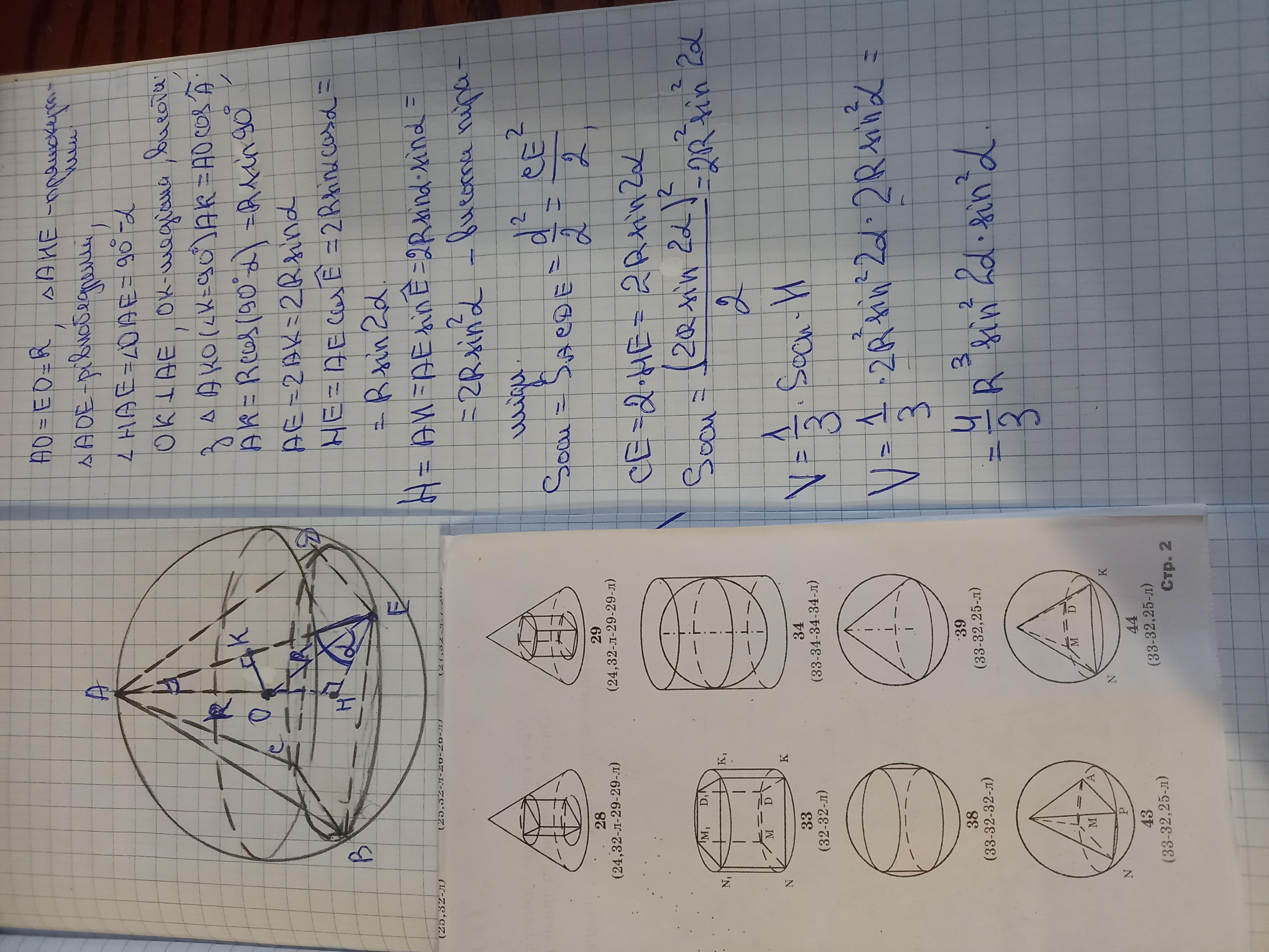 Знайдіть об'єм правильноï чотирикутної піраміди вписаноï в кулю радіуса R, бічне ребро якої утворює з площиною основи кута