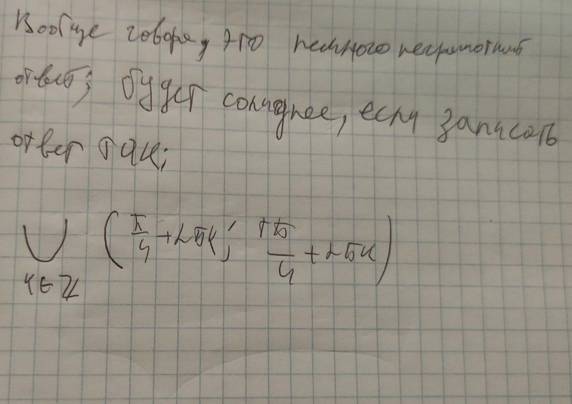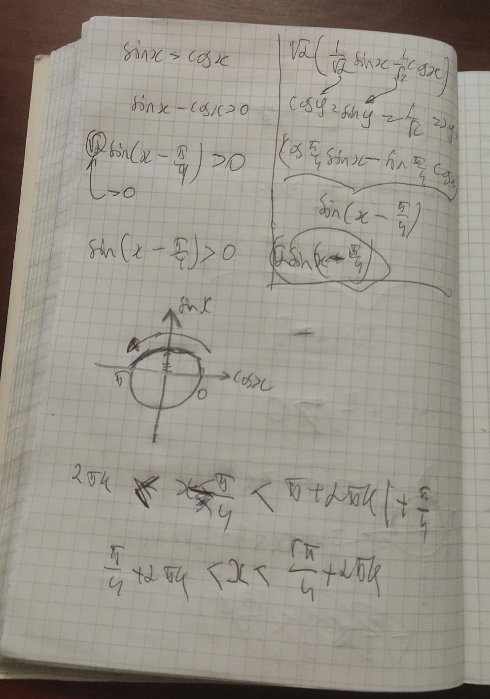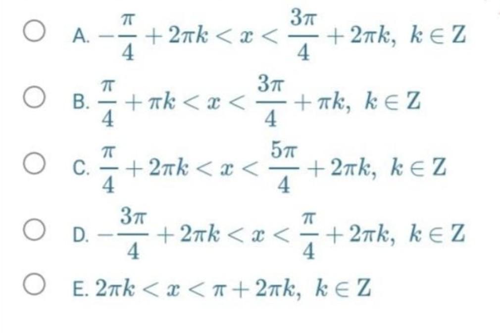 Ответ: π/4+2πk<x<5π/4+2πk, kЄZ(Целое число).