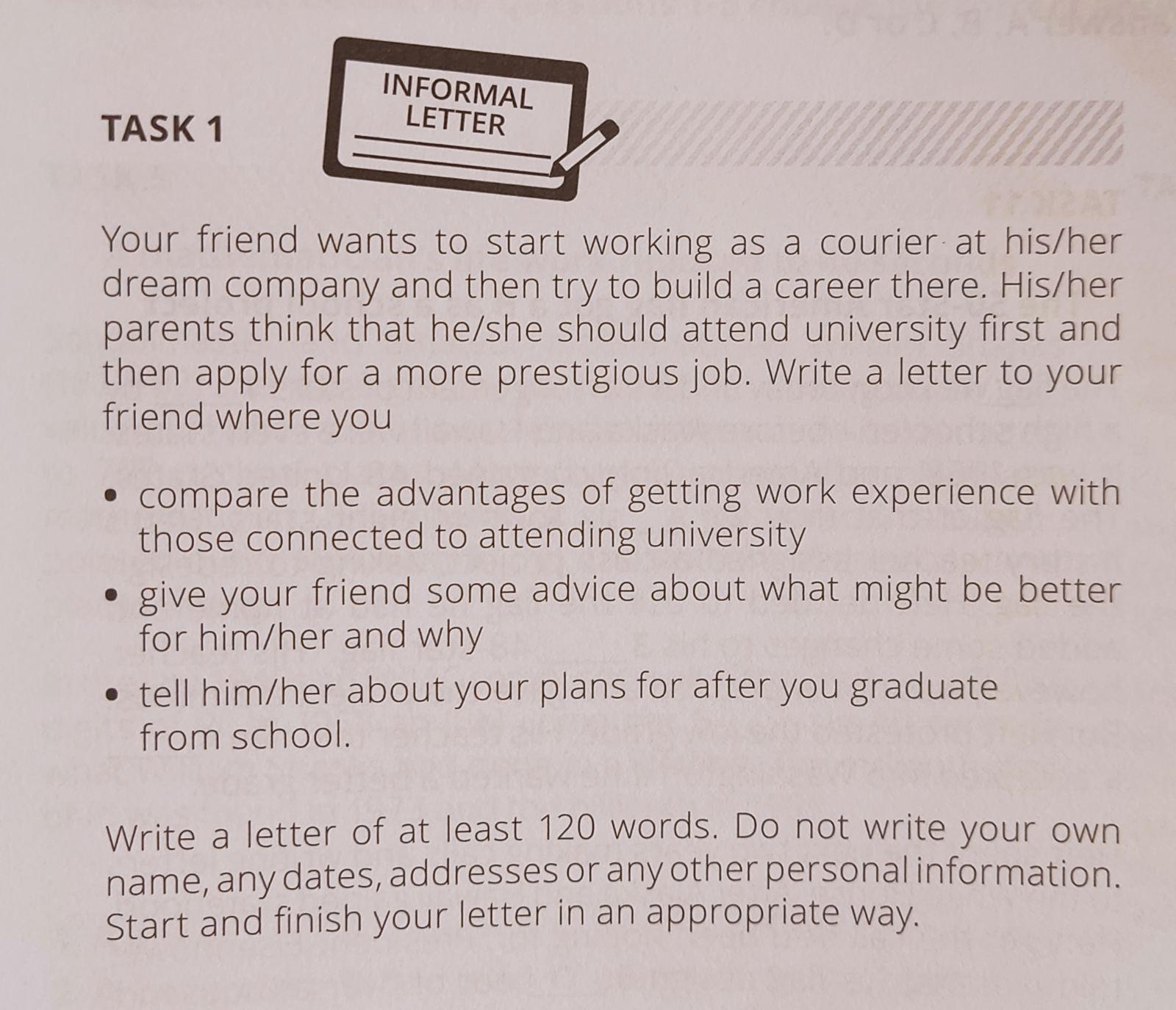 (англійською будь ласка)Ваш друг хоче почати працювати кур'єром у компанії своєї мрії, а потім спробувати побудувати там кар'єру. Його/її батьки вважають, що він/вона має спочатку вступити до університету, а потім претендувати на більш престижну роботу. Напишіть листа своєму другові, в якому ви порівнюєте переваги отримання досвіду роботи з тими, хто пов’язаний із навчанням в університеті, дайте своєму другові пораду щодо того, що може бути краще для нього та чому. Напишіть лист щонайменше 120 слів. Не пишіть власне ім'я, дати, адреси чи іншу особисту інформацію. Почніть і закінчіть свій лист належним чином.