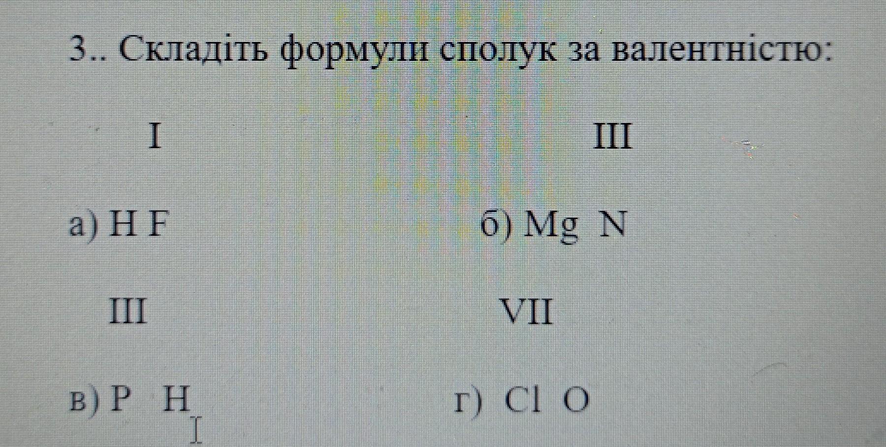 3.. Складіть формули сполук за валентністю: I III a) HF б) Mg N III VII B) P H г) Cl o I