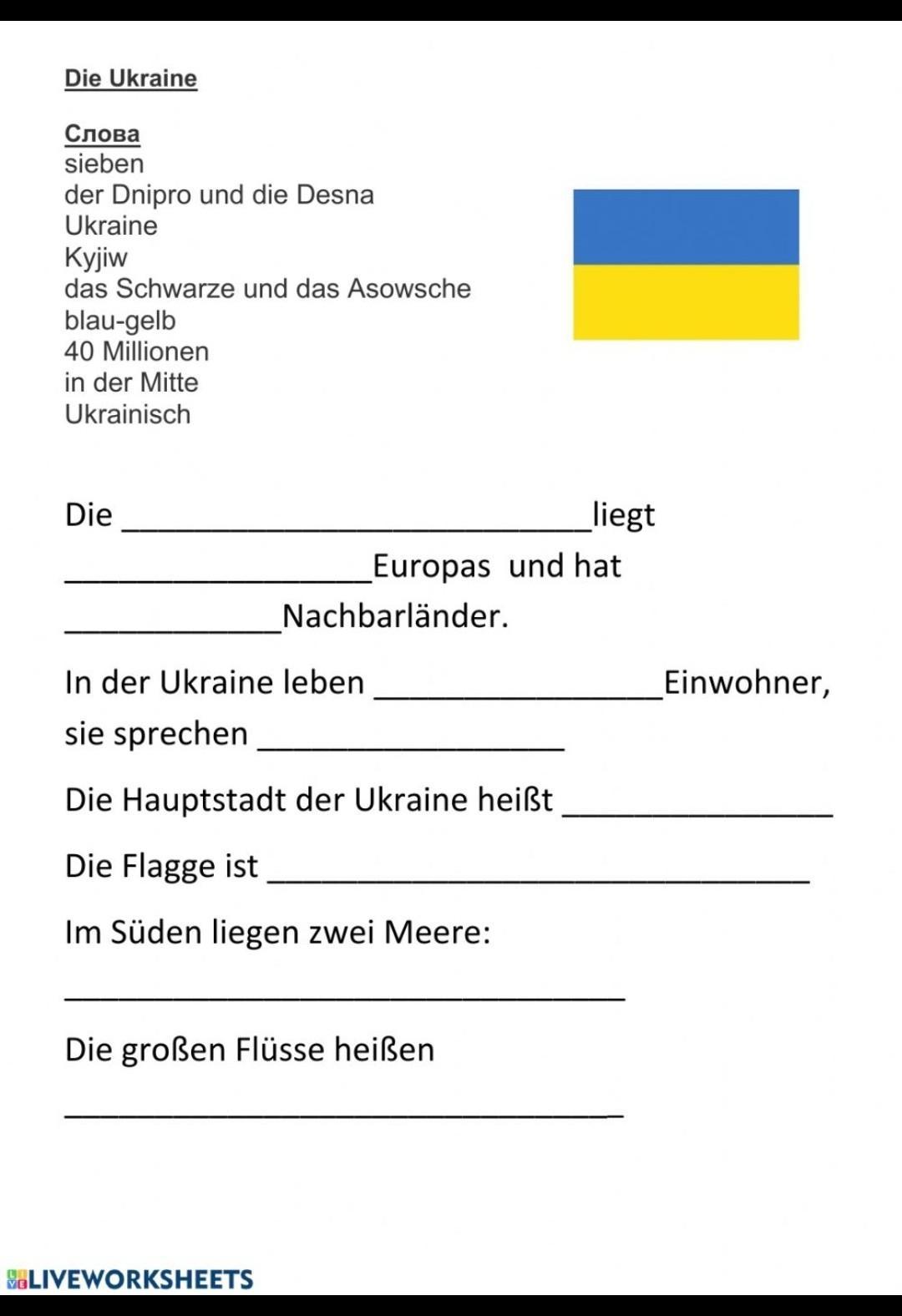Die Ukraine liegt in der Mitte Europas und hat sieben Nachbarländer. In der Ukraine leben 40 Millionen Einwohner, sie sprechen Ukrainisch. Die Hauptstadt der Ukraine heißt Kyjiw. Die Flagge ist blau-gelb. Im Süden liegen zwei Meere:das Schwarze und das Asowsche. Die großen Flüsse heißen der Dnipro und die Desna.