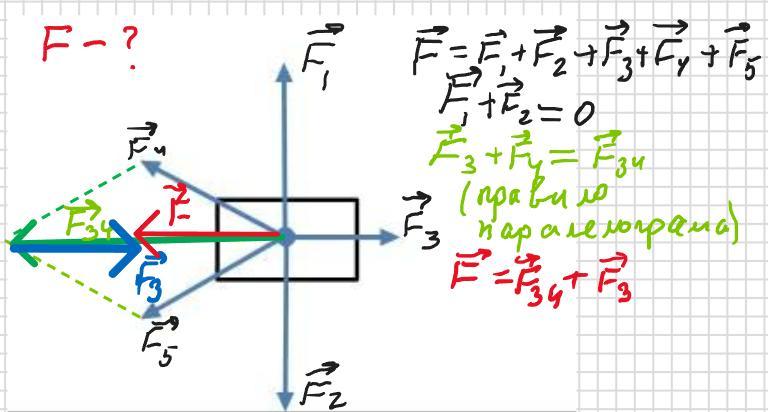 На тiло діє кілька сил зображених на малюнку. Куди буде направлене результуюче прискорення? Знайти рівнодійну силу графічно.