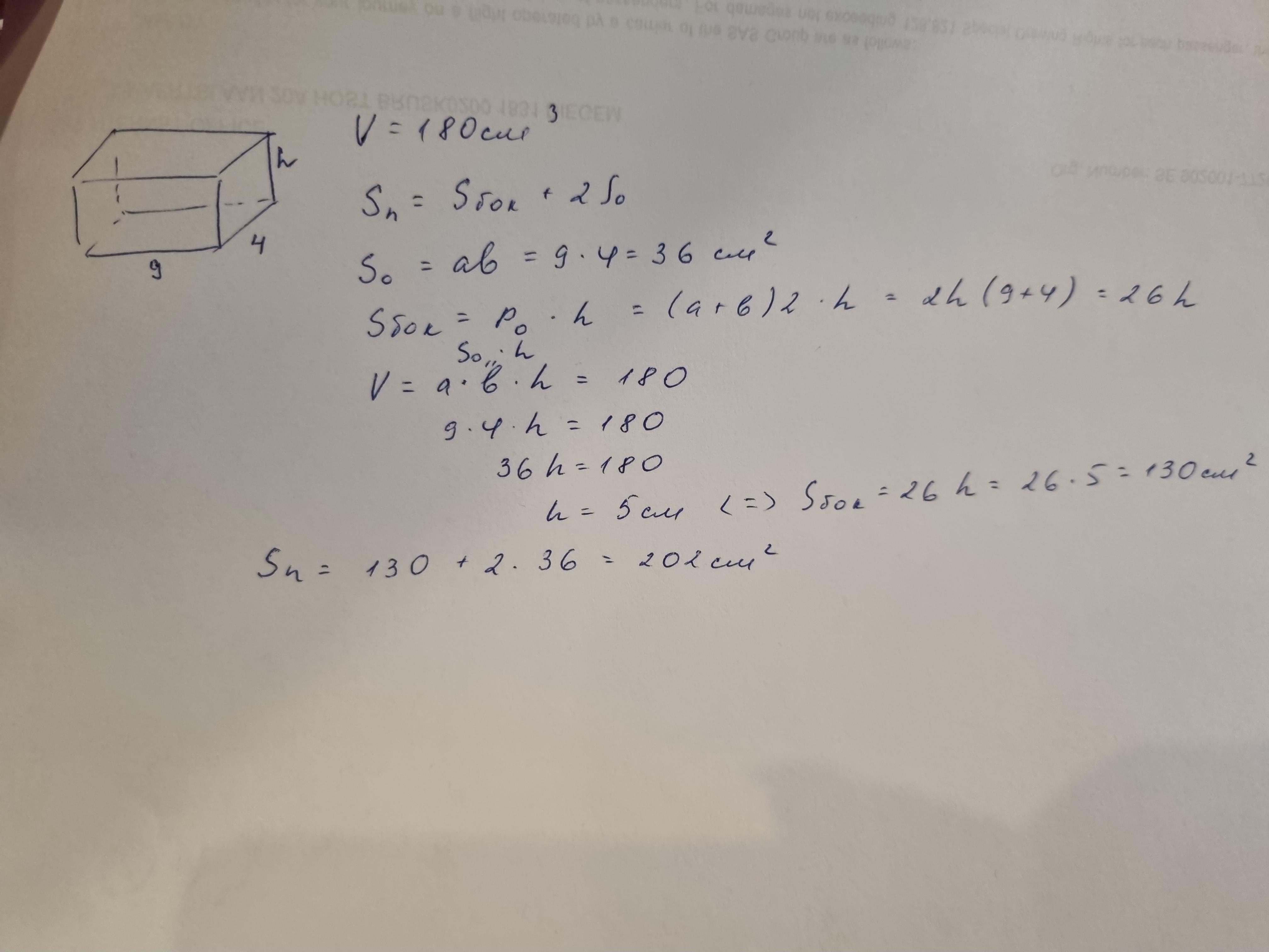 Объем прямоугольного параллелепипеда равен 180 см3. Его длина и ширина равны 9 см и 4 см. Найдите площадь поверхности параллелепипеда