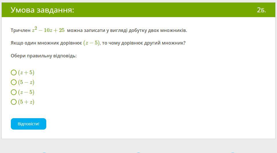 Тричлен z2−10z+25 можна записати у вигляді добутку двох множників.