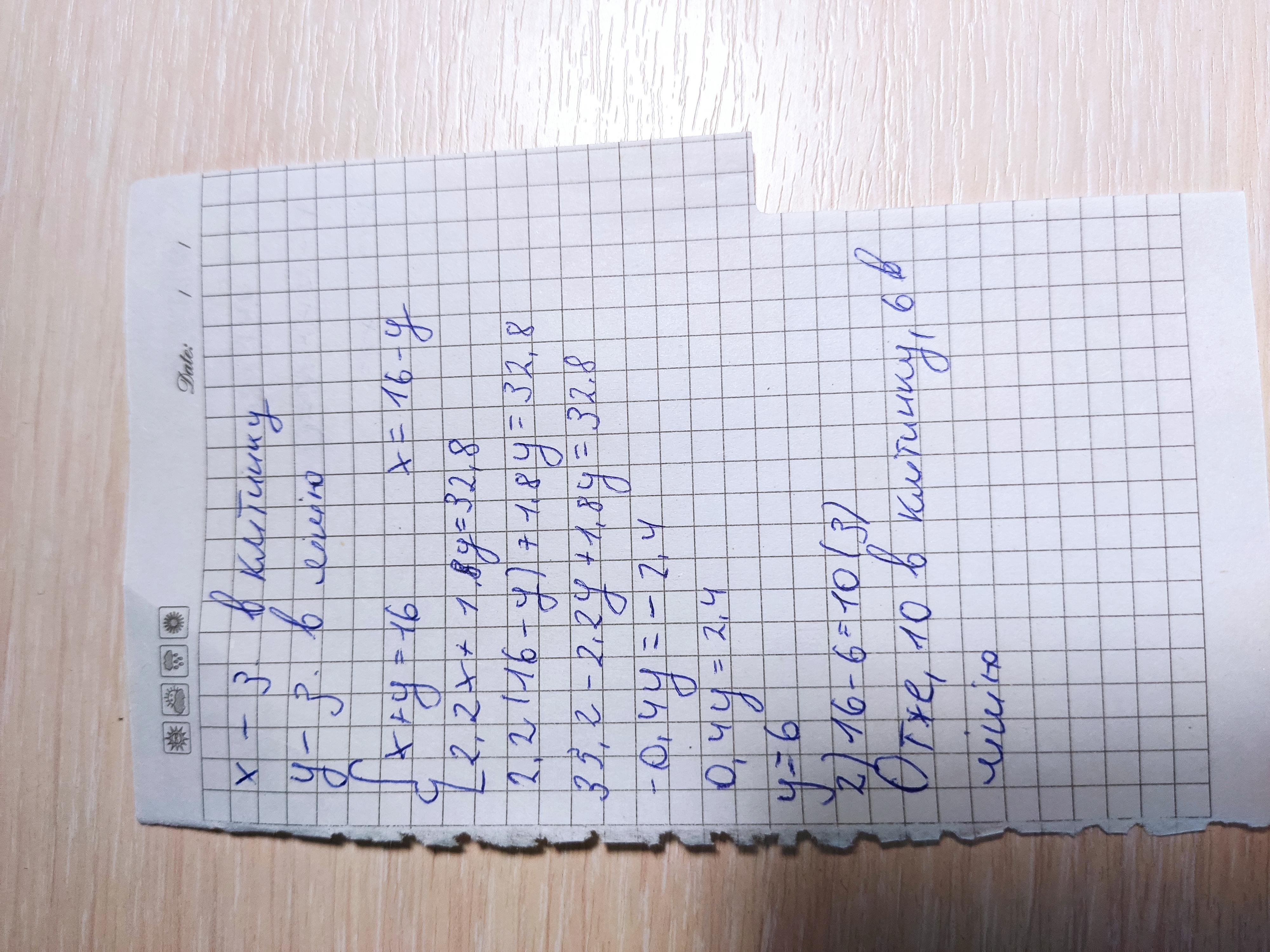 Було придбано 16 зошитів у клітинку і лінійку, усього на суму 32,80 грн. Зошит у клітинку коштує 2,20 грн, а в лінійку 1,80 грн. Ск. зошитів у клітинку і скільки в лінійку купували? (Система рівнянь) можна не рахувати)