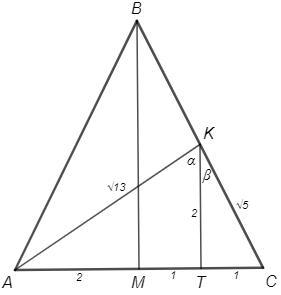 Даны треугольник АВС. Основание равнобедренного треугольника АС и высота ВМ равны по 4 см. На сторону ВС проведена медиана АК. Найди cos ∠AKC.
