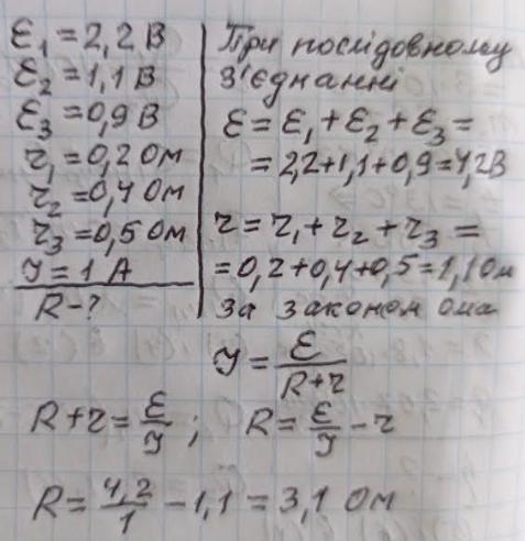Три гальванічні елементи, ЕРС яких 2,2 В; 1,1 В; 0,9 В, а внутрішні опори відповідно