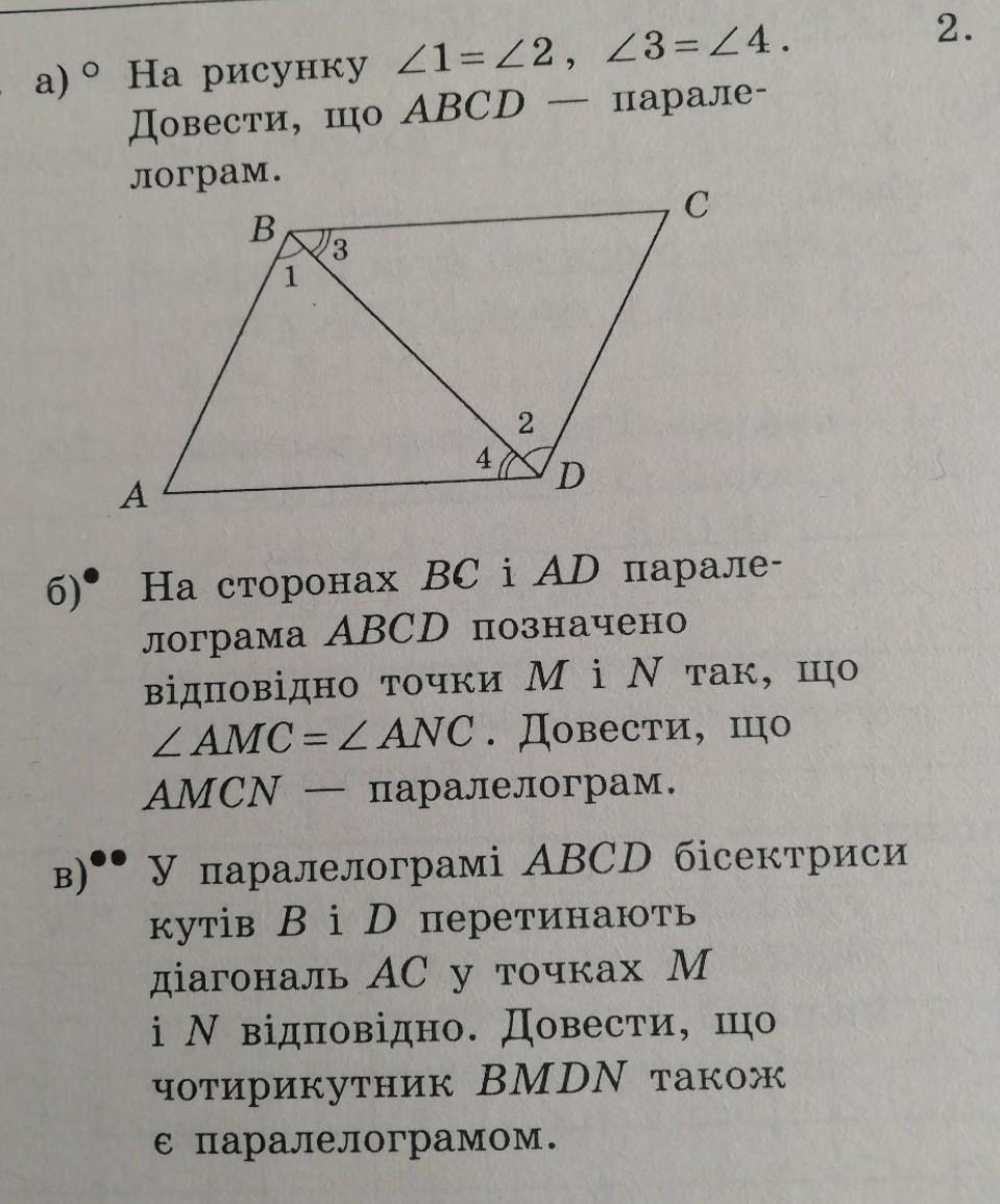 2.УглAMC равен углуANC - противоположные. Так как у четырехугольника сумма всех углов равна360, а соседние углы дают 180, то углMAN равен углуMCN. Противоположные углы равны, а соседние дают 180 это параллелограмм.