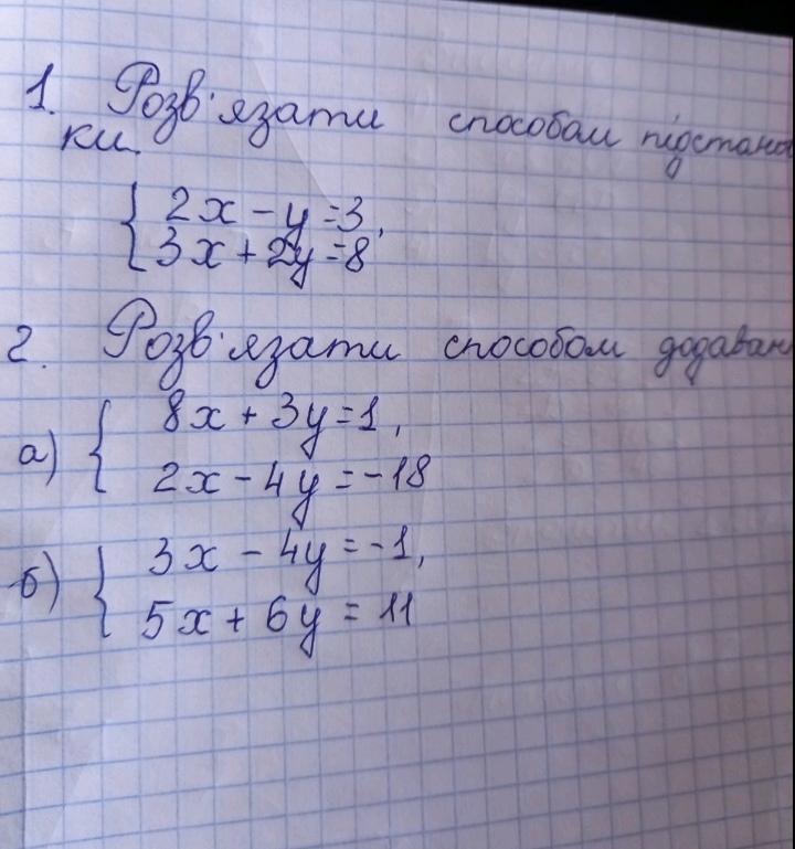 помогите сделать дз с алгебры, 7 клас, тема: 1) розв'язування систем лінійних рівнянь методом підстановки 2)розв'язування систем лінійних рівнянь методом додавання