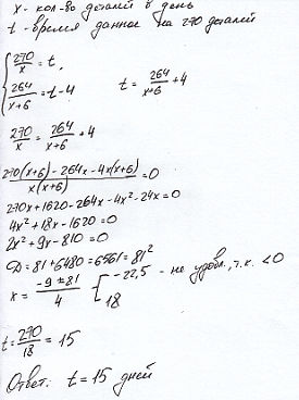 Бригаде рабочих было поручено в определенный срок изготовить 270 деталей . Перевыполняя план , она ежедневно изготовляла на 6 деталей больше, чем планировалось, а потому за 4 дня до срока бригада сдала 264 детали.За сколько дней бригада должна была выполнить задание?