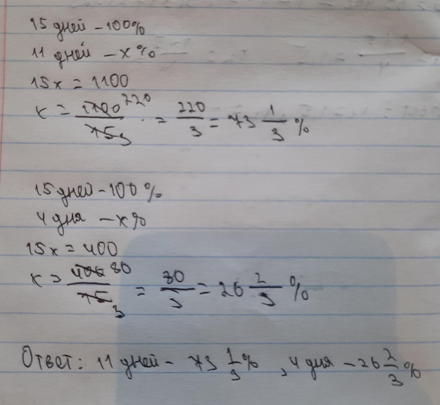 Из 15 дней иследования выяснилось что 11 дней не удачные, 4 дня удачные. Посчитайте сколько % состовляет 4 дня, а сколько 11 дней.