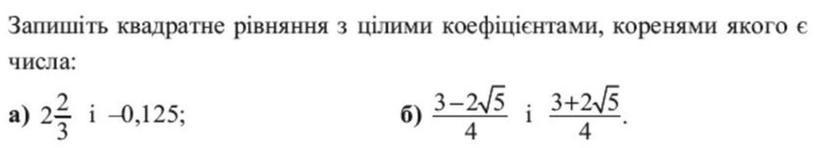 запишіть квадратне рівняння з цілими коефіцієнтами, коренями якого є числа 2,2/3 і -0,125