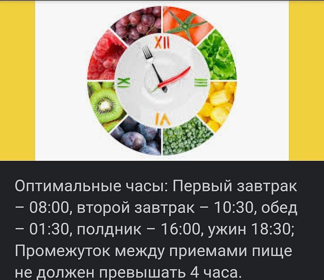 Оптимальные часы: Первый завтраки- 8:00, второй завтрак - 10:30, обед - 1:30, полдник - 16:00, ужин 18:30