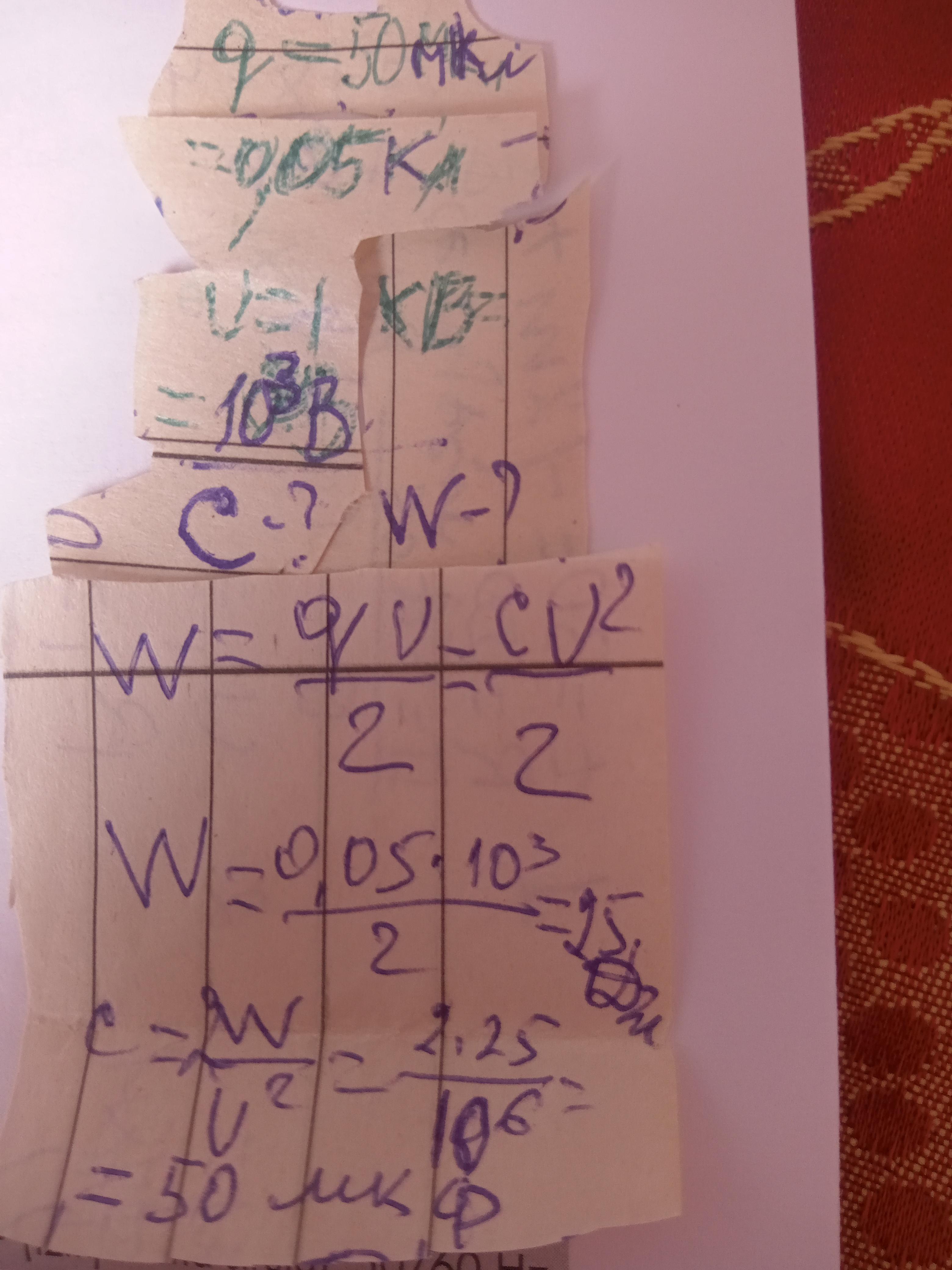 1. Якою є ємність конденсатора, заряд якого дорівнює 50 мКл, якщо напруга між обкладками дорівнює 1кВ? Яку енергію здатний нагромаджувати такий конденсатор?
