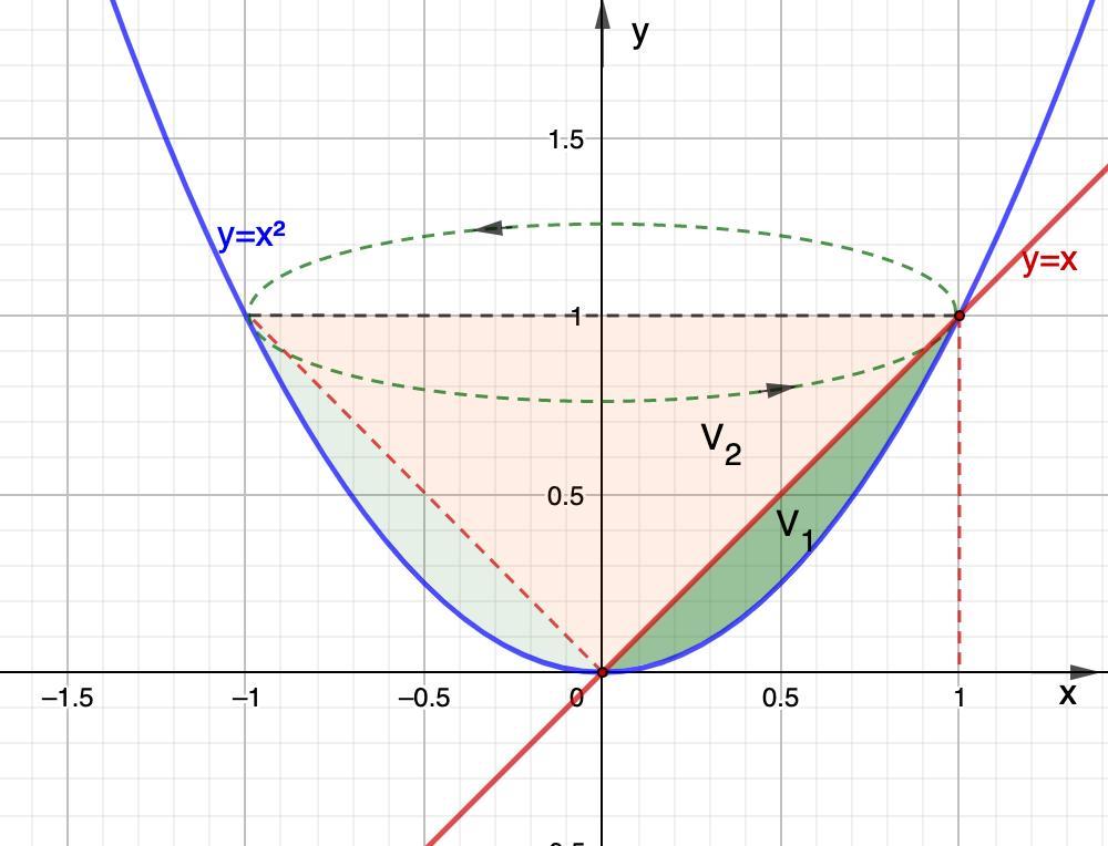 Искомый объем будет равен разности объемов параболоида, образованного вращением кривой х² = у и конуса, образованного вращением прямой х = у.