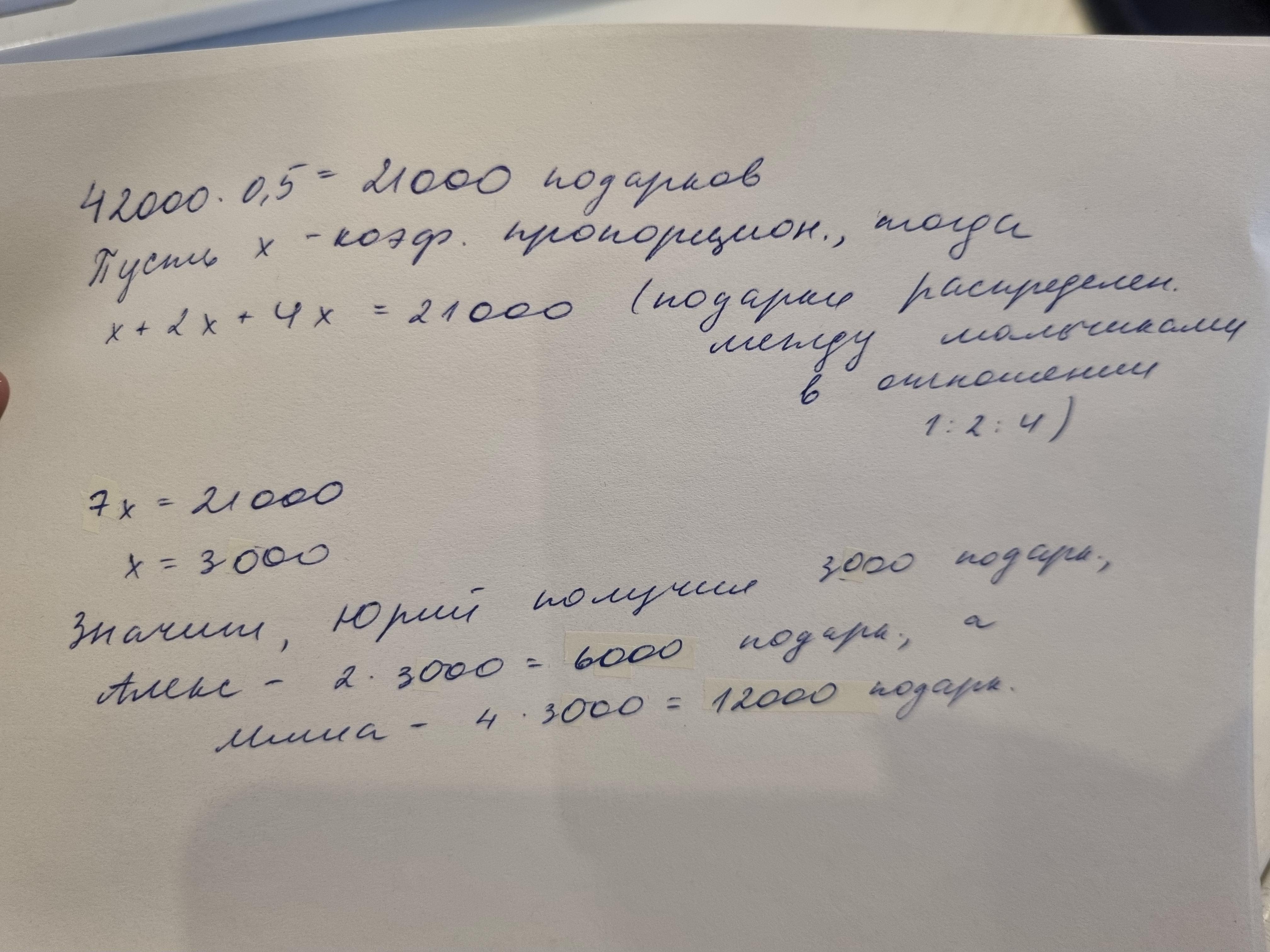 подарено 42000 подарков. 50% подарков было распределены между девочками, а остальные были отданы мальчикам - Юрий, Алекс, Миша - в отношении 1 : 2 : 4