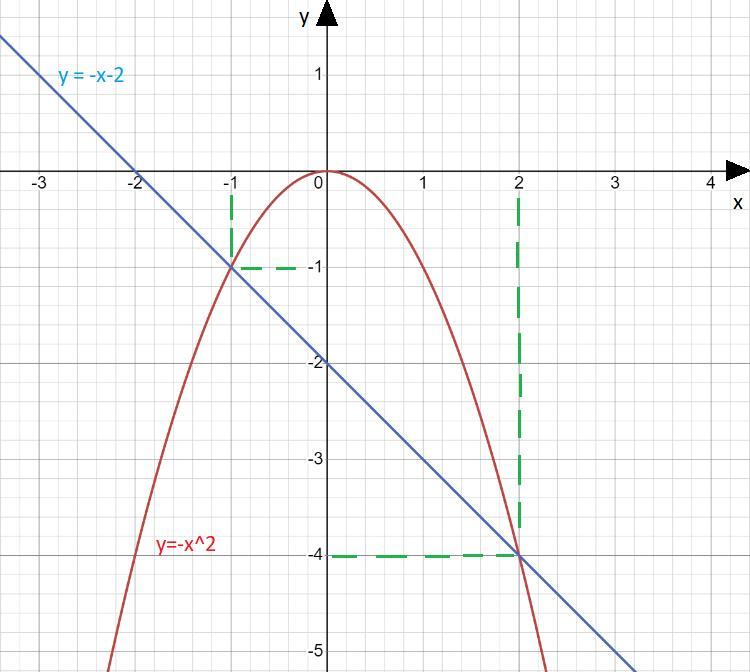 Графики пересекаются в точках, абсциссы которых х₁ = -1 и х₂ = 2.