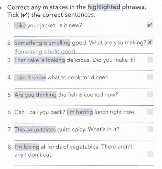 b Correct any mistakes in the highlighted phrases. Tick (✔) the correct sentences. 1 I like your jacket. Is it new? 2 Something is smelling good. What are you making? x Something smells good. 3 That cake is looking delicious. Did you make it? 4 I don't know what to cook for dinner. 5 Are you thinking the fish is cooked now? 6 Can I call you back? I'm having lunch right now. 7 This soup tastes quite spicy. What's in it? 8 I'm loving all kinds of vegetables. There aren't any I don't eat.