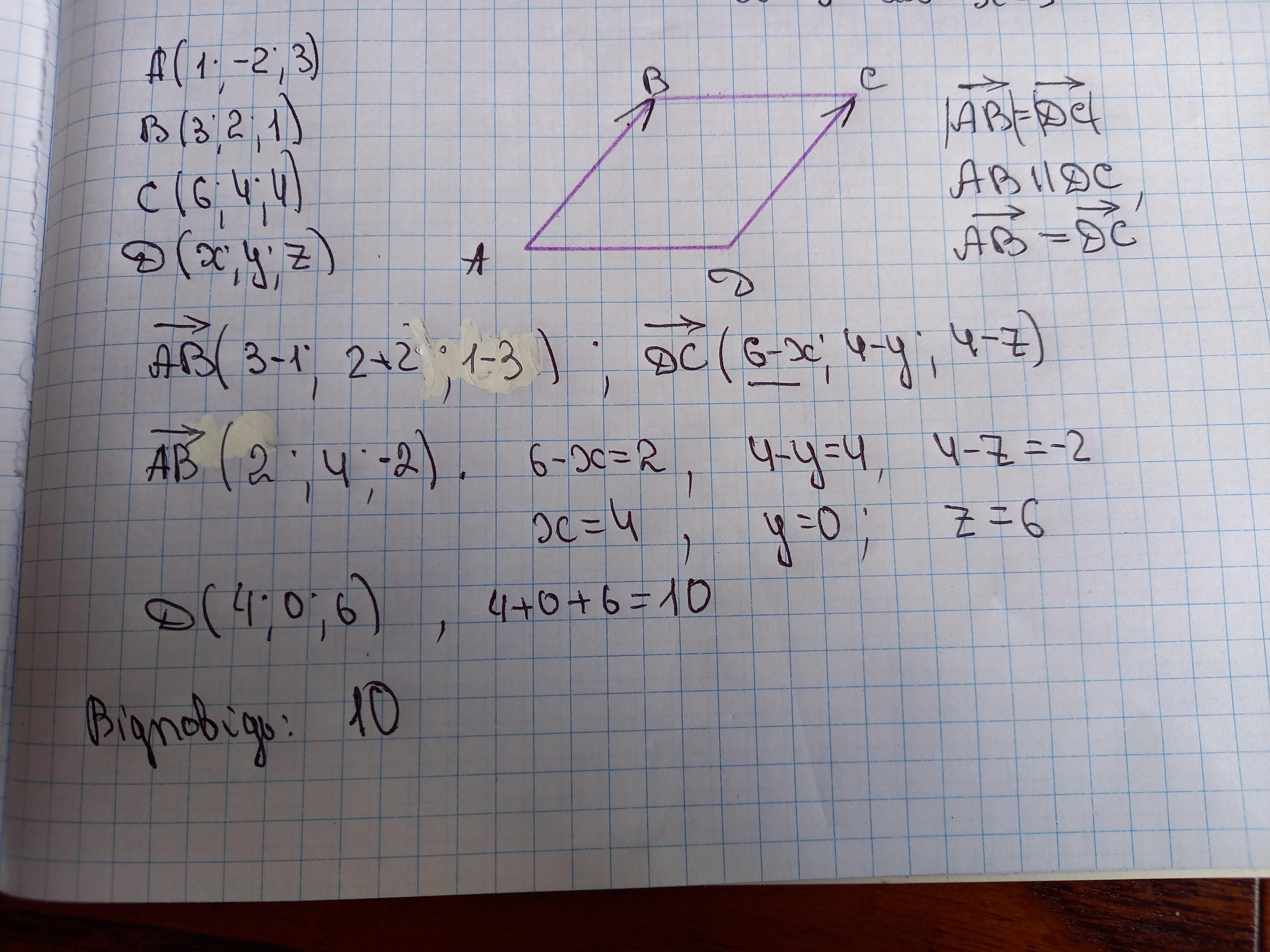 дано три послідовні вершини паралелограма А(1;-2;3)В(3;2;1)С(6;4;4).Визначте суму координат його четвертої вершини D