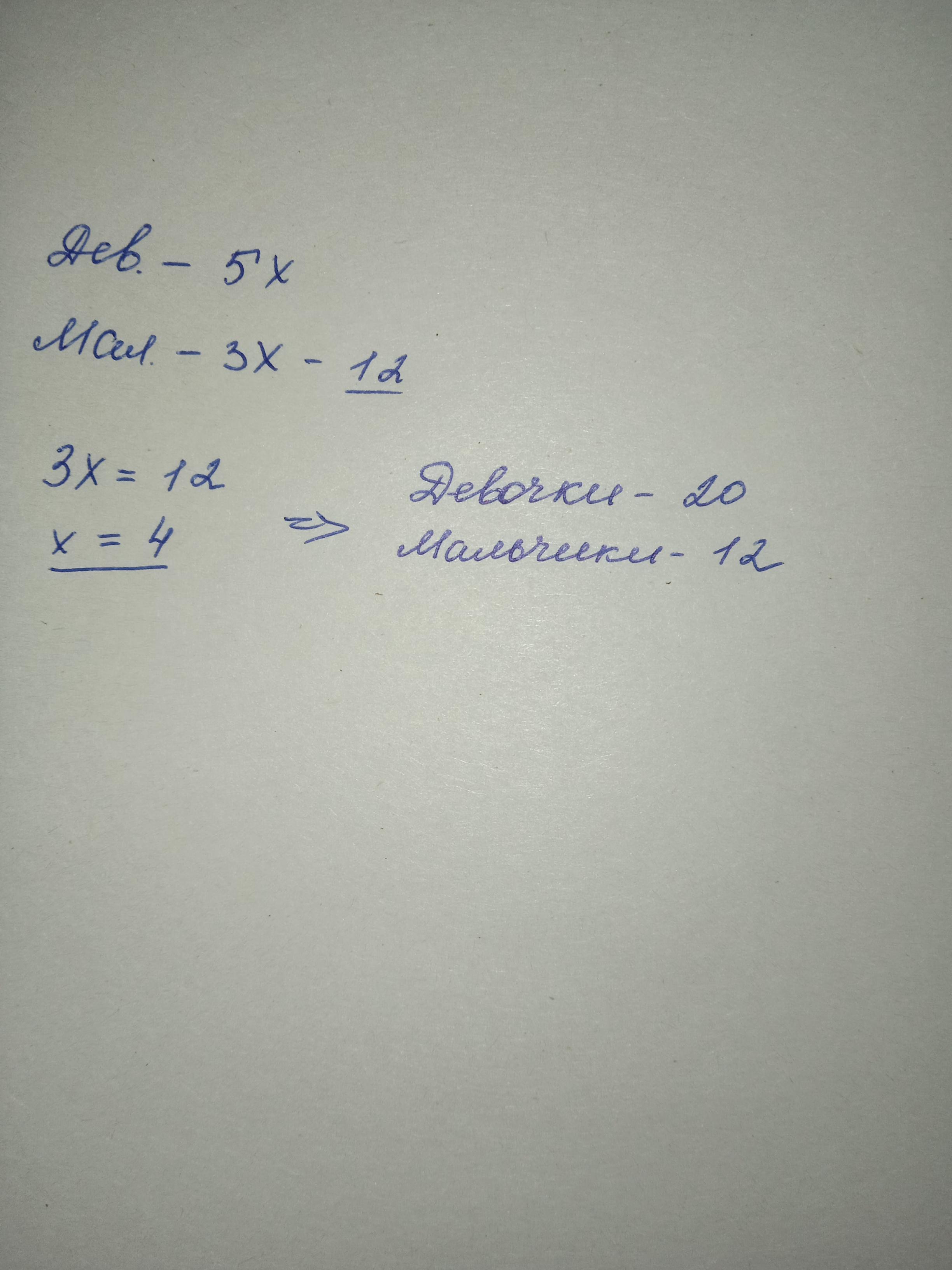 Соотношение девочек и мальчиков в классе 5:3 в классе 12 мальчиков. Сколько девочек в этом классе?