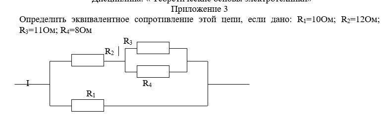 Определить эквивалентное сопротивление этой цепи, если дано: R1=10Ом; R2=12Ом; R3=11Ом; R4=8Ом
