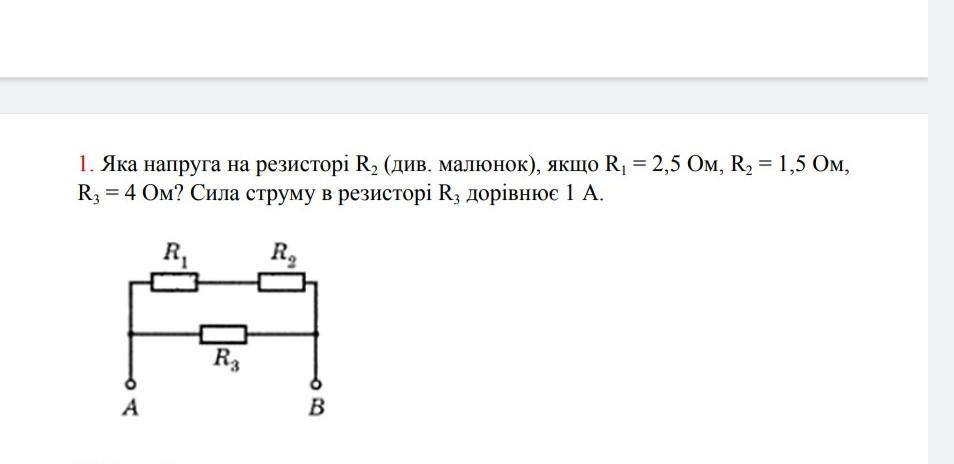 Срочно ....Яка напруга на резисторі R2 (див. малюнок), якщо R1 = 2,5 Ом, R2 = 1,5 Ом, R3 = 4 Ом? Сила струму в резисторі R3 дорівнює 1 А.
