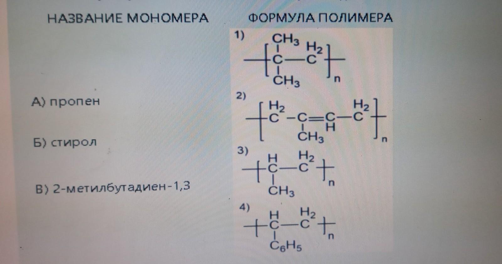 Установите соответствие между названием мономера и формулой полимера, который получают из данного мономера: к каждой позиции, обозначенной буквой, подберите соответствующую позицию, обозначенную цифрой.