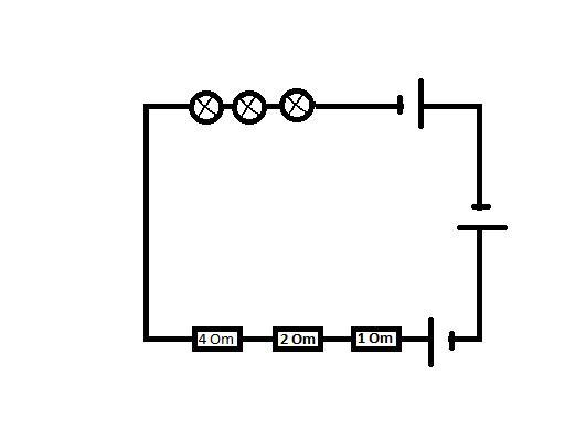 Начертите схемы последовательного соединения трех одинаковых ламп, трех гальванических элементов и трех резисторов сопротивлением 1 Ом, 2 Ом и 4 Ом. Ответьте на следующие вопросы: