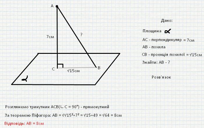 довжину похилої, якщо довжина проекції похилої до площини рівна √15 см.