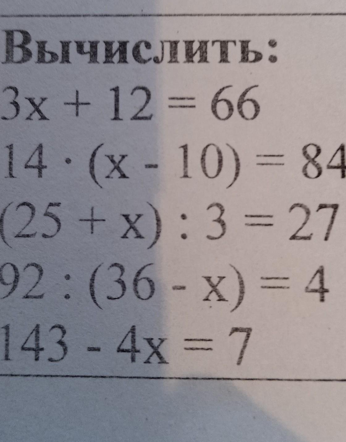 Вычислить: 3x + 12 = 66 14. (x - 10) =84 (25+x): 3 = 27 92: (36-x) =4 143 - 4x = 7