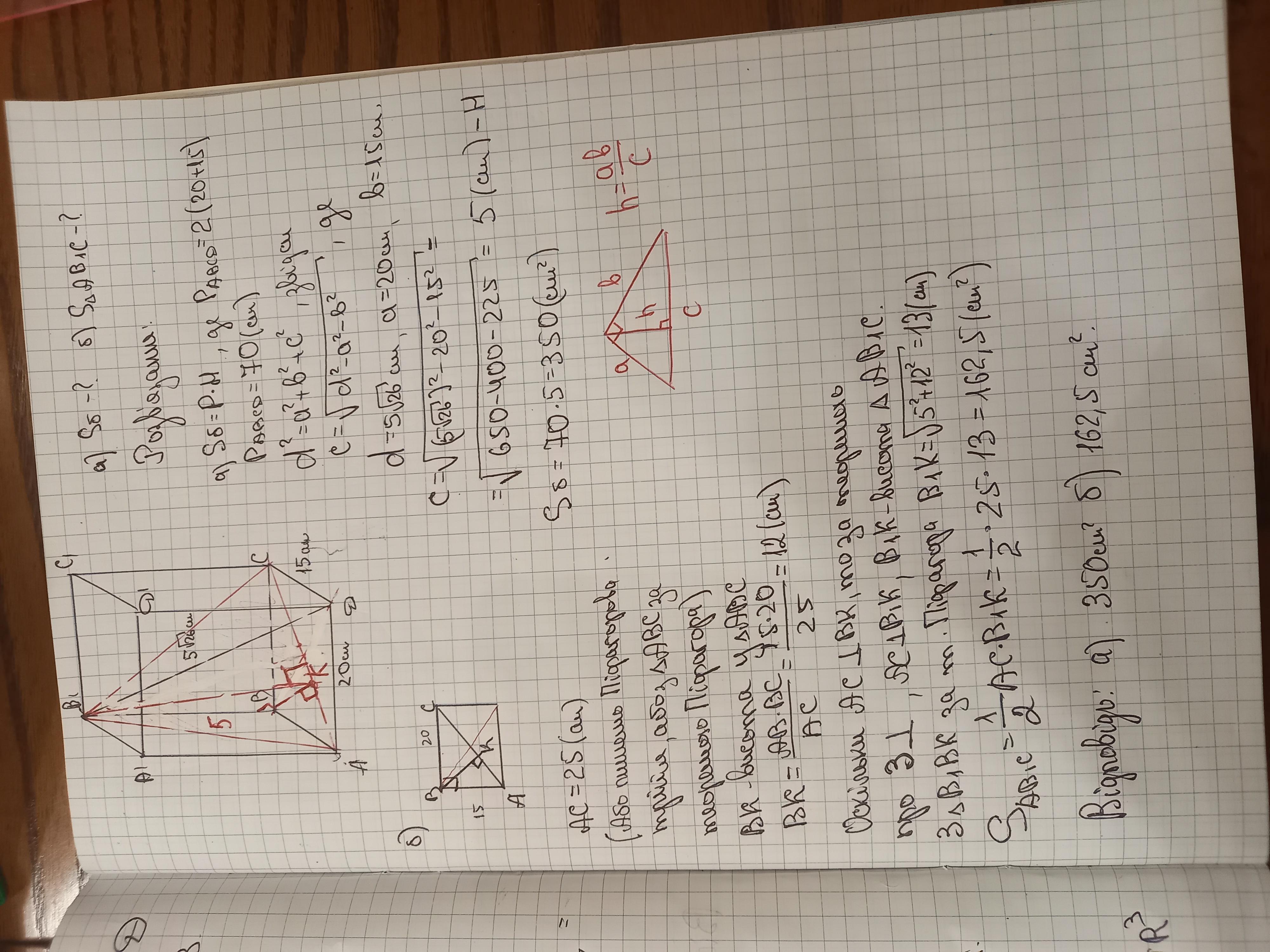 Сторони основ прямокутного паралелепіпеда дорівнюють 15 см і 20 см, а діагональ - 5√26 см. Знайдіть: а) Бічну поверхню паралелепіпеда б) Площу перерізу, проведену через діагональ основи і протилежну вершину іншої основи