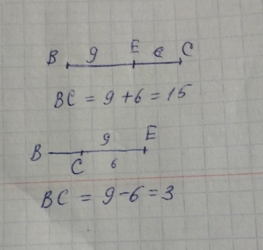 на отрезке bc отмечена точка e так что be равно 9см,EC=6см.Найдите длину отрезка BC. СРОЧНО ПЖ! даю 40 баллов