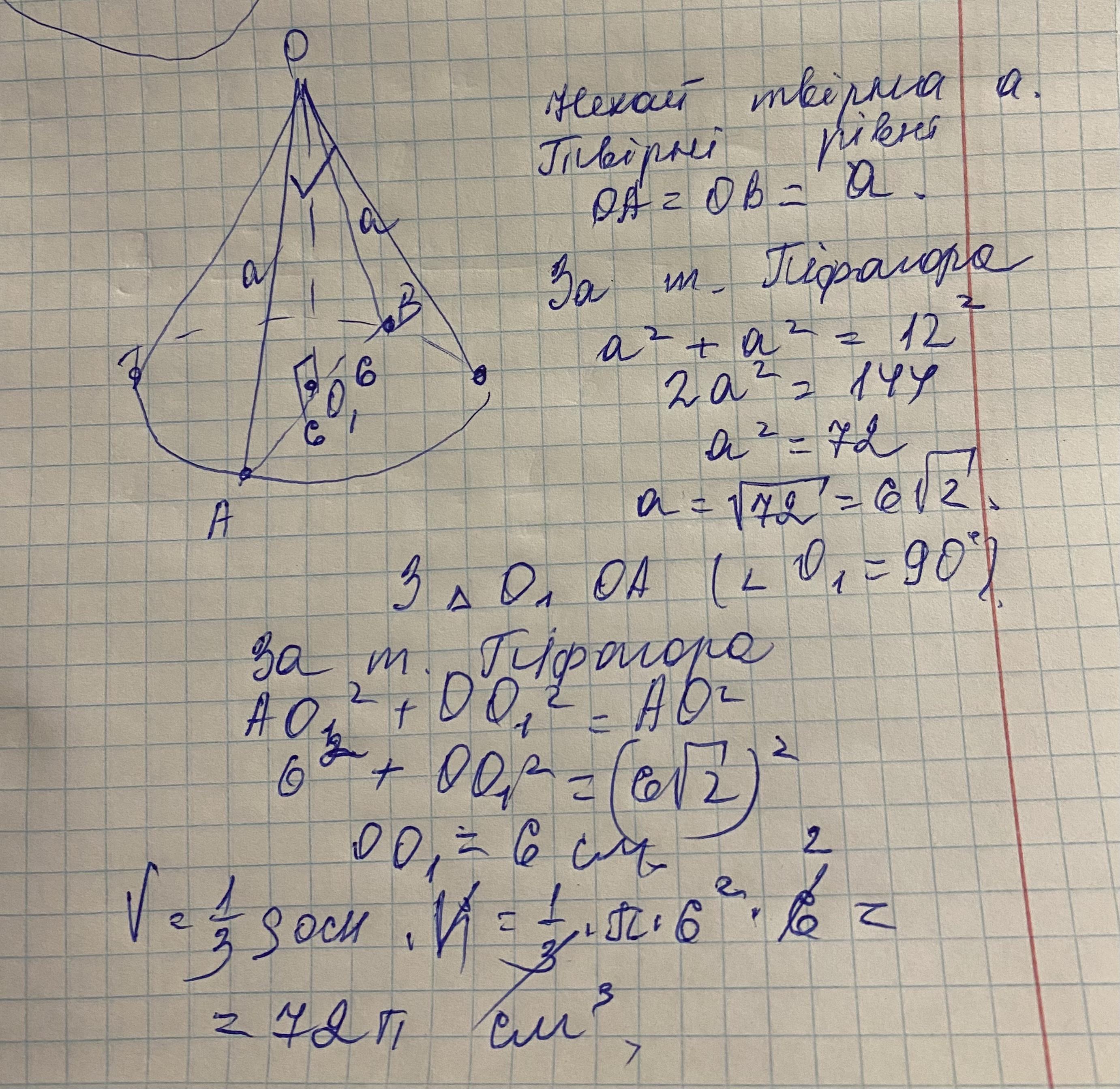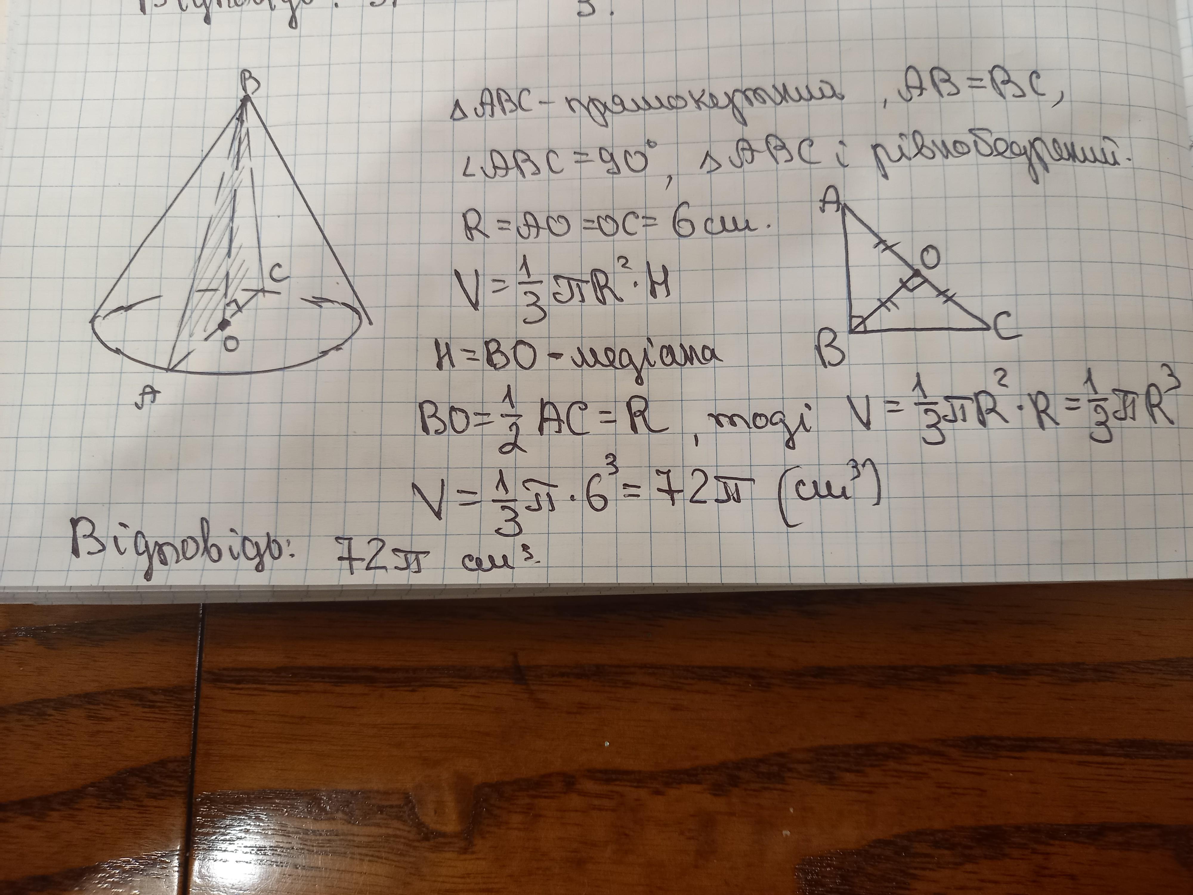 Основним перерізом конуса є прямокутний трикутник. Радіус основи конуса 6 см. Знайти V конуса
