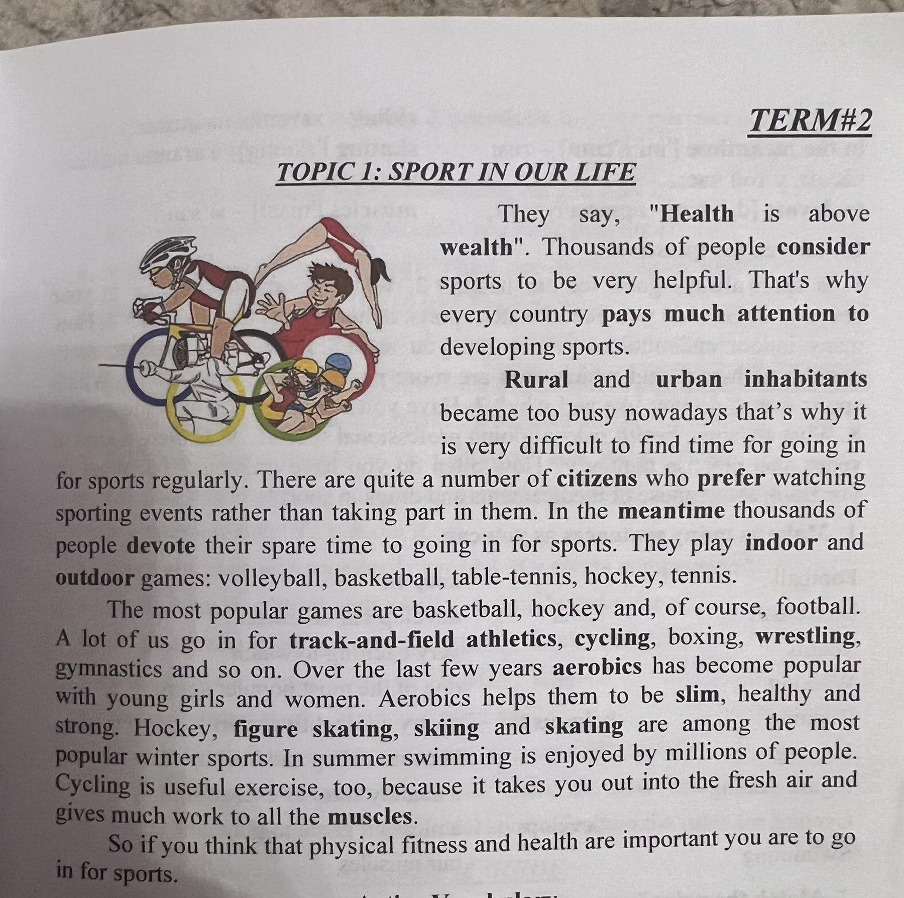 People become too busy to find time for going in for sports regularly. Many citizens prefer watching gymnastics, athletics, boxing, wrestling than taking part in them. Thousands of people play indoor and outdoor games: volleyball, basketball, table tennis, chess, hockey, tennis. The most popular games are basketball, hockey and football. Women and girls are fond of aerobics. The most popular winter sports are hockey, figure skating, skiing and skating. In summer millions of people enjoy swimming and cycling. Sport is very important for us.