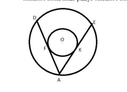 Проведемо відрізок ОК, який є радіусом меншого кола. За властивістю дотичної ОК перпендикулярно АЕ. Трикутник АОК прямокутний. АО=8 см є бісектрисою кута DAE, а також гіпотенузою трикутника АОК. Тоді кут ОАК =30°. За властивістю прямокутного трикутника, катет який лежить проти кута 30° в 2 рази менше за гіпотенузу.